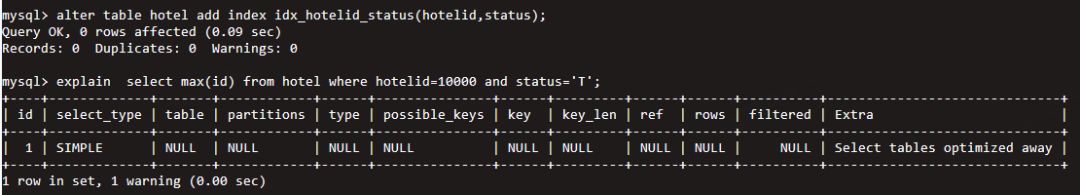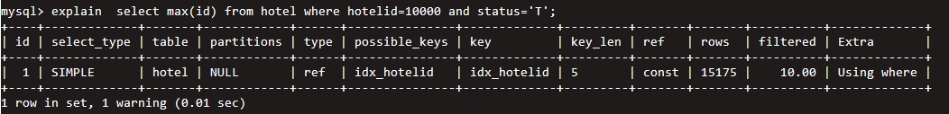 explain select max(id) from hotel where hotelid=10000 and status='T';