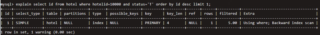 explain select id from hotel where hotelid=10000 and status='T' order by id desc limit 1;
