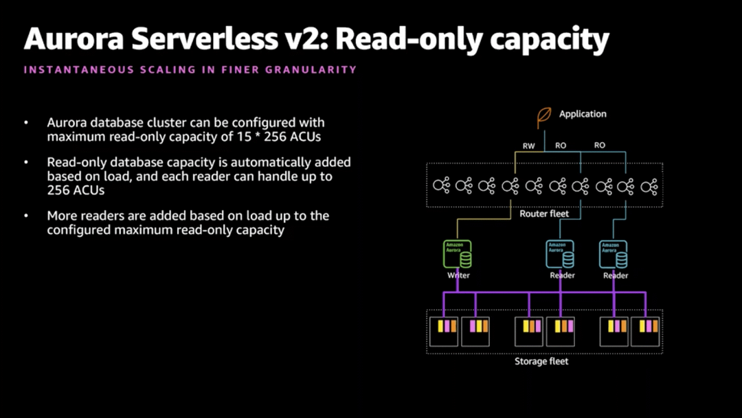 Aurora Serverless 一个亮点能力是增加“只读”能力。在v2版本中可最多增加15个只读节点,每个节点可扩充至256个ACU。