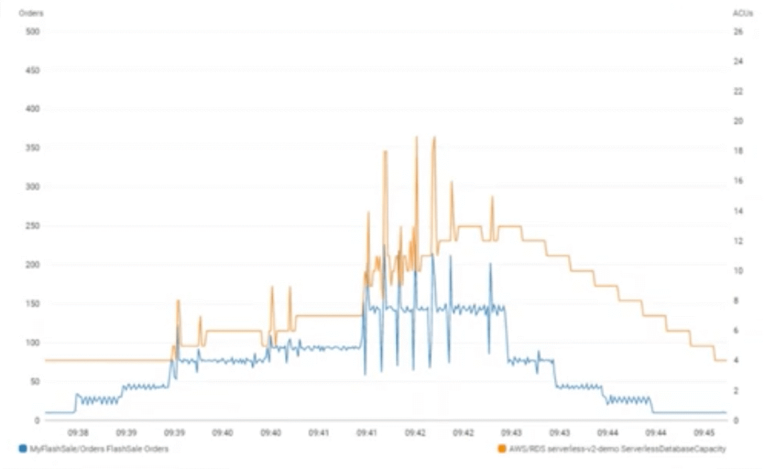 上图显示业务压力(蓝色)和ACU(橙色)的变化曲线。随着业务的增长和缩减,ACU资源随之变化。ACU 由内存 (RAM) 和处理器 (CPU) 组成。CPU 利用率的增加可立即响应工作负载需求。当需求从峰值开始下降时,随着内存的释放速度(相比于 CPU)越来越慢,从最大 ACU 向下扩展的速度也更慢。这是一种经过深思熟虑的架构选择。Aurora Serverless v2随着需求的减少而逐渐释放内存,以避免影响工作负载。