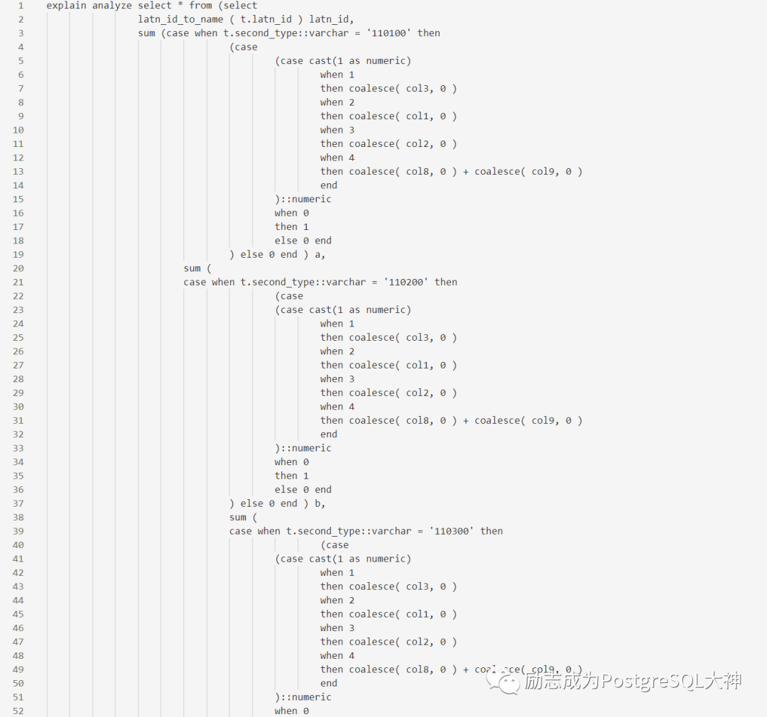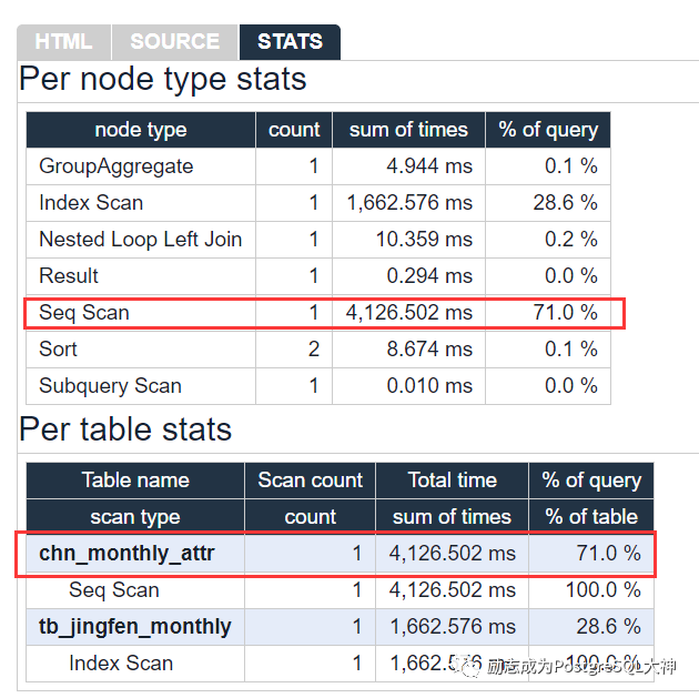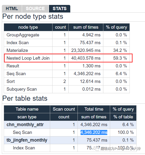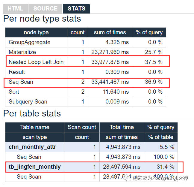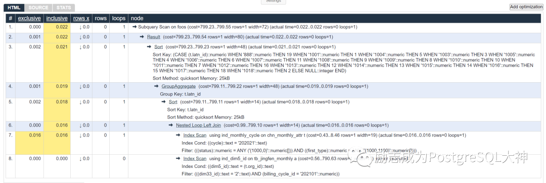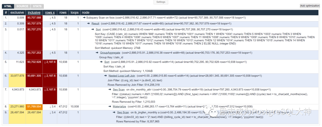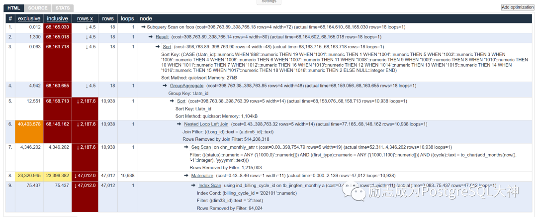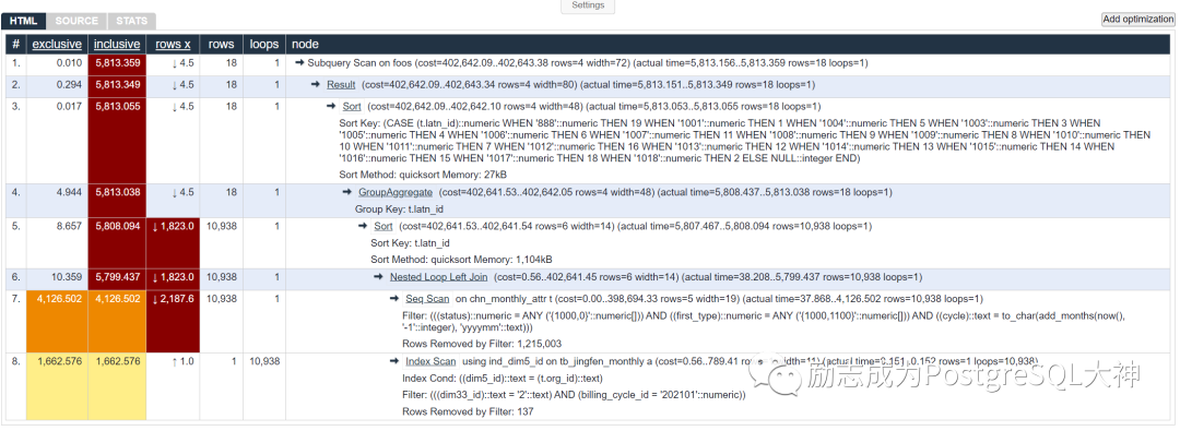 SQL和执行计划都拿出来,然后将执行计划拷贝到我之前发布的执行计划格式工具网站上。(https://explain.depesz.com/)