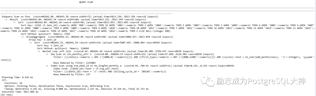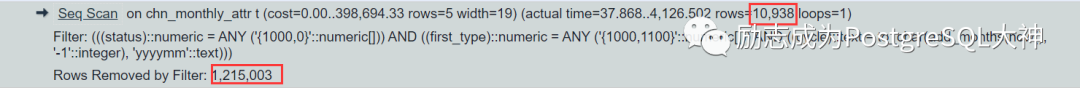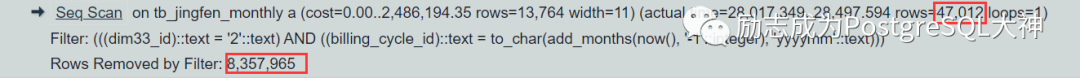 请注意,在Seq Scan和 Nested Loop Left Join上的消耗是最大的,分别占36.9%和37.5%。另外, Seq Scan主要有两张表,对「tb_jingfen_monthly」表的全表扫描占31.4%。因此优化首先要从这个全表扫描开始。该全表扫描的过滤条件是步骤9。