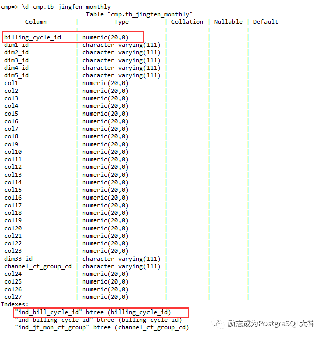 cmp=> select count(1) from cmp.tb_jingfen_monthly; count --------- 8404977(1 row)cmp=> select count(1) from cmp.tb_jingfen_monthly a where a.dim33_id::varchar = '2'; count --------- 2789589(1 row)cmp=> select count(1) from cmp.tb_jingfen_monthly a where a.billing_cycle_id::text = to_char( add_months ( now(),- 1 ), 'yyyymm' ); count -------- 141036(1 row)