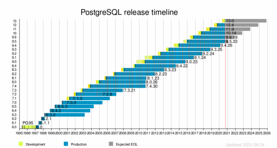 PostgreSQL全球开发小组每年会发布一个主要版本,同时支持维护5个最近主要版本,目前已发展到PostgreSQL 13版本。