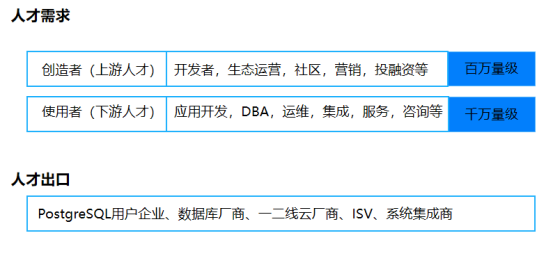 无论是大数据、云计算技术发展还是国家政策引导,国内有越来越多的数据库厂商、云厂商、企业用户在使用PostgreSQL,自然就会产生大量的人才需求。这些岗位包括了数据库的内核开发、应用管理、技术服务、咨询、生态运营等诸多方面。各大数据库企业用户、数据库厂商、互联网云厂商、应用软件供应商、系统集成商便是数据库人才的主要去向。