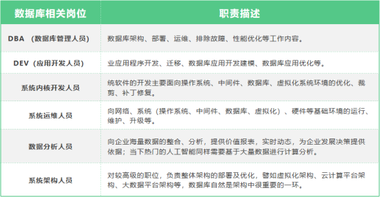 下面简单整理了与数据库相关的岗位描述,供有志向从事数据库技术相关工作的同学参考:
