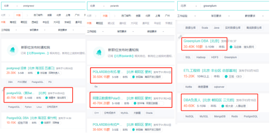 通过Boss招聘网站搜索Postgres相关的工作,能看到PG技术工程师岗位的薪资都很可观,而且需求量也不小,感兴趣的同学可以去查看一下。