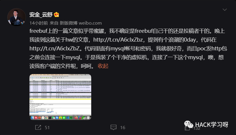 在昨天(2021年4月11号),云舒大佬发了一个微博,疑似有人在在Freebuf上发了一篇带有蜜罐的文章,代码里面有MySQL帐号和密码。经云舒大佬连接测试后,发现这个MySQL服务器会读取连接它的客户端上的文件。