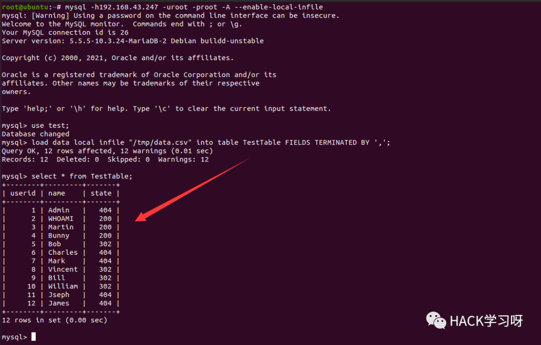 功能将文件内容发送回攻击者的MySQL服务器。攻击者收到受害者服务器上的信息,读取文件成功,攻击完成。