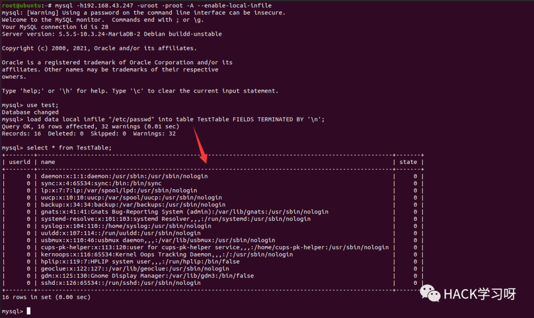 如上图所示,我们成功将客户端上的/etc/passwd文件读取到了服务端MySQL的数据表中。很显然,LOAD DATA INFILE