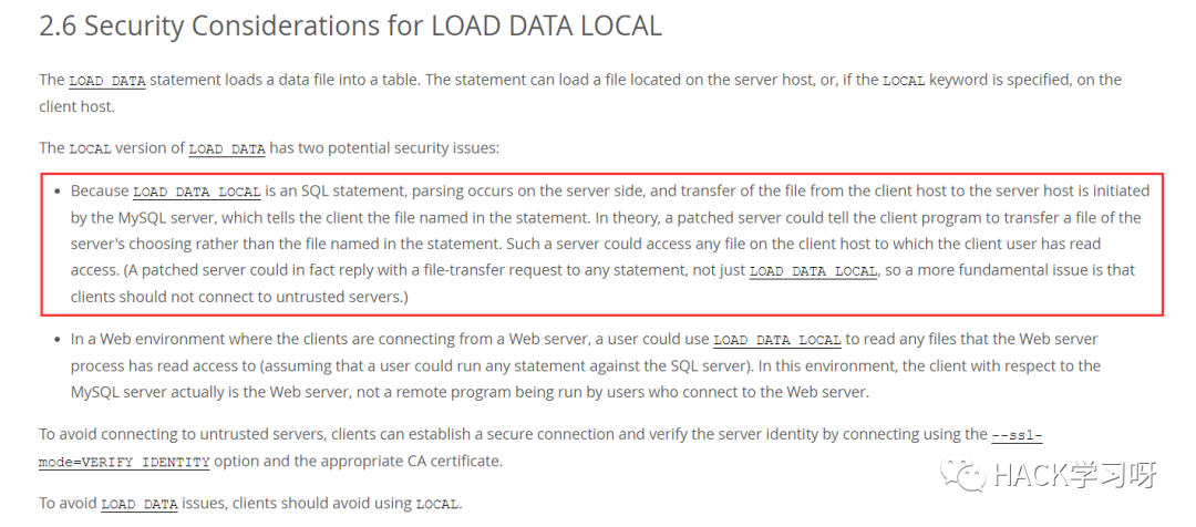 这个语句是不安全的,在MySQL的官方文档里也充分说明了这一点:https://dev.mysql.com/doc/mysql-security-excerpt/5.7/en/load-data-local-security.html