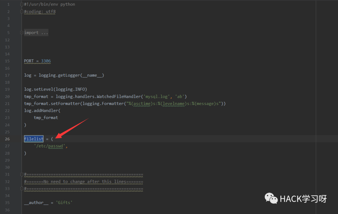 首先下载大佬写好的POC脚本 Rogue-MySql-Server,找到 rogue_mysql_server.py 脚本的第26行处的元组 filelist