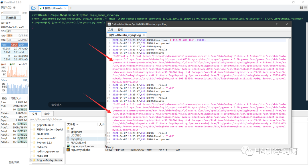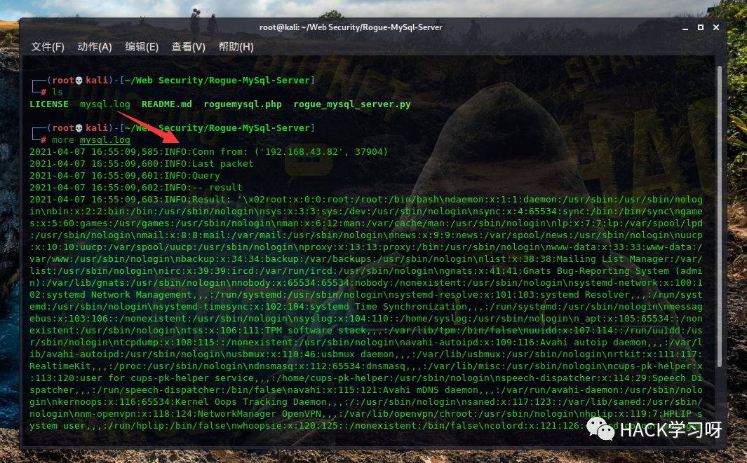 当客户端连上攻击机搭建的服务端瞬间,服务端便可以读取到受害机客户端上的/etc/passwd,并记录到 Rogue-MySql-Server 中的日志文件中: