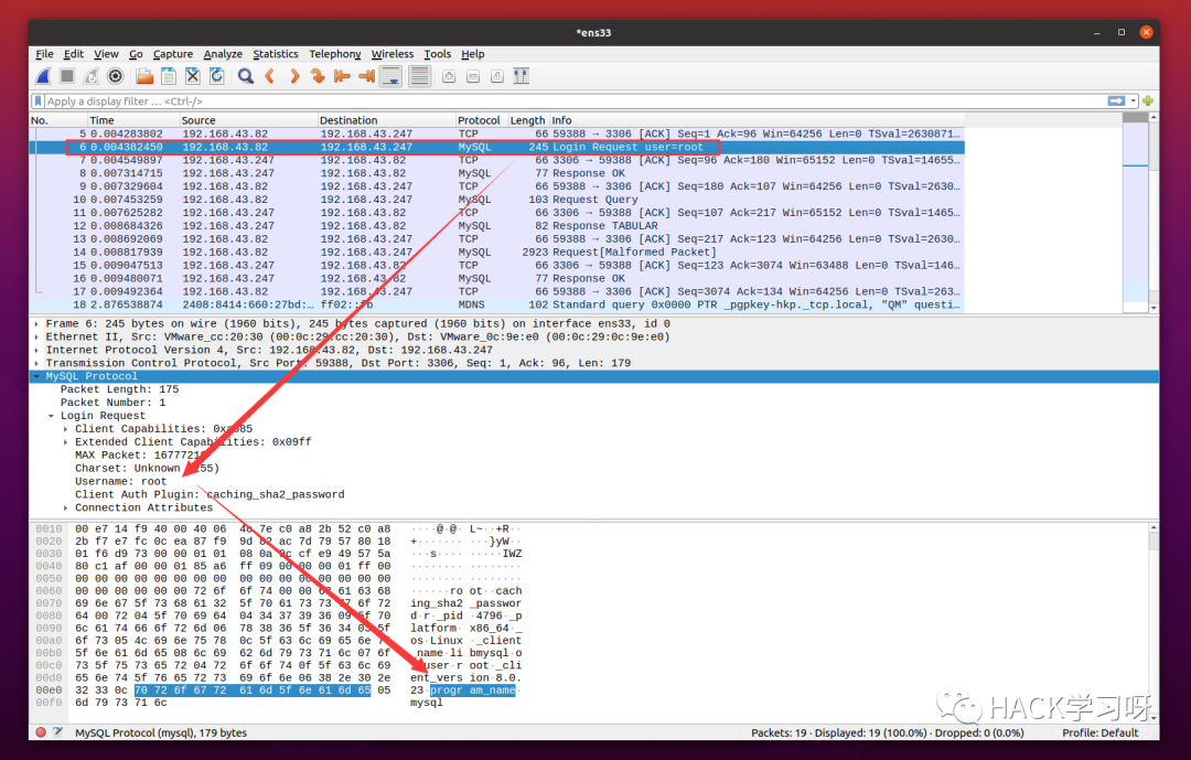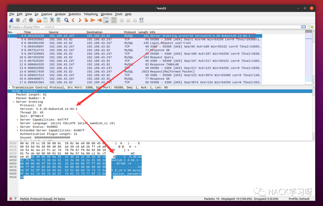 (1)客户端连接上攻击者伪造的服务端瞬间,服务端会向客户端发送 "Greeting" 数据包,服务端返回的banner,其中包含MySQL的版本等信息: