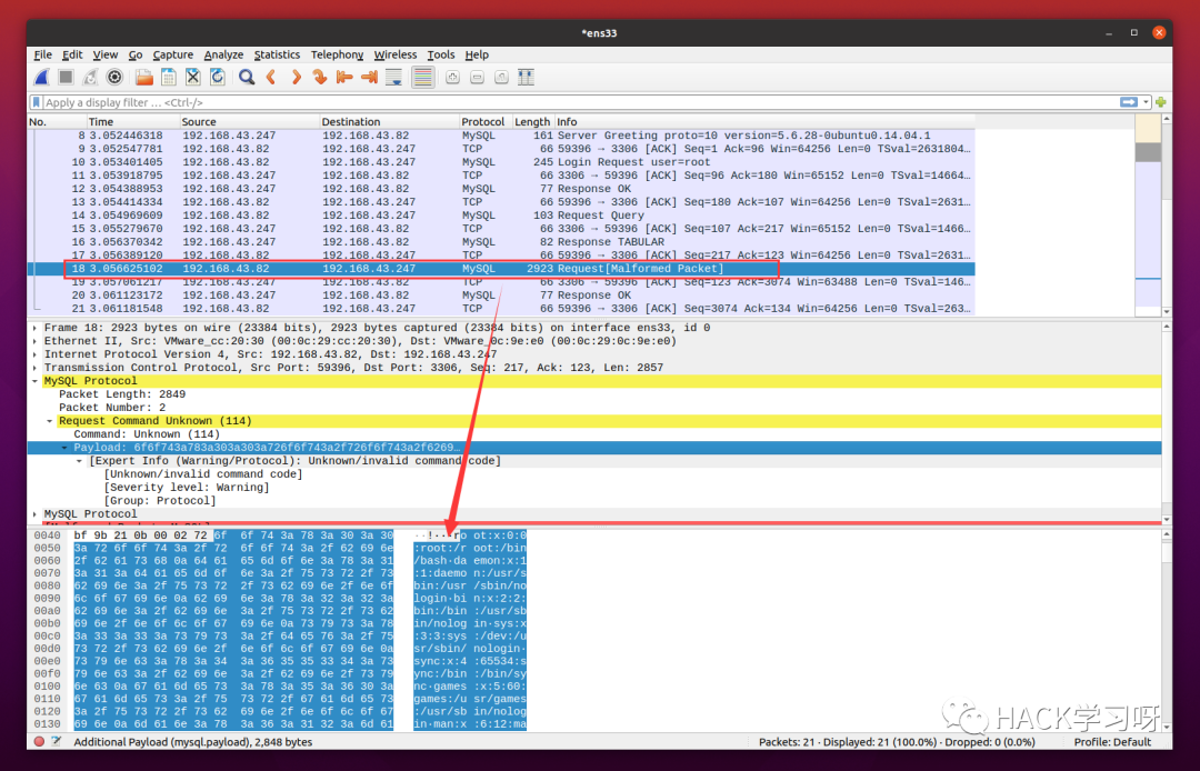 从抓到的流量包中我们可以看到,服务端读取了客户端上的 etc/passwd 文件内容。