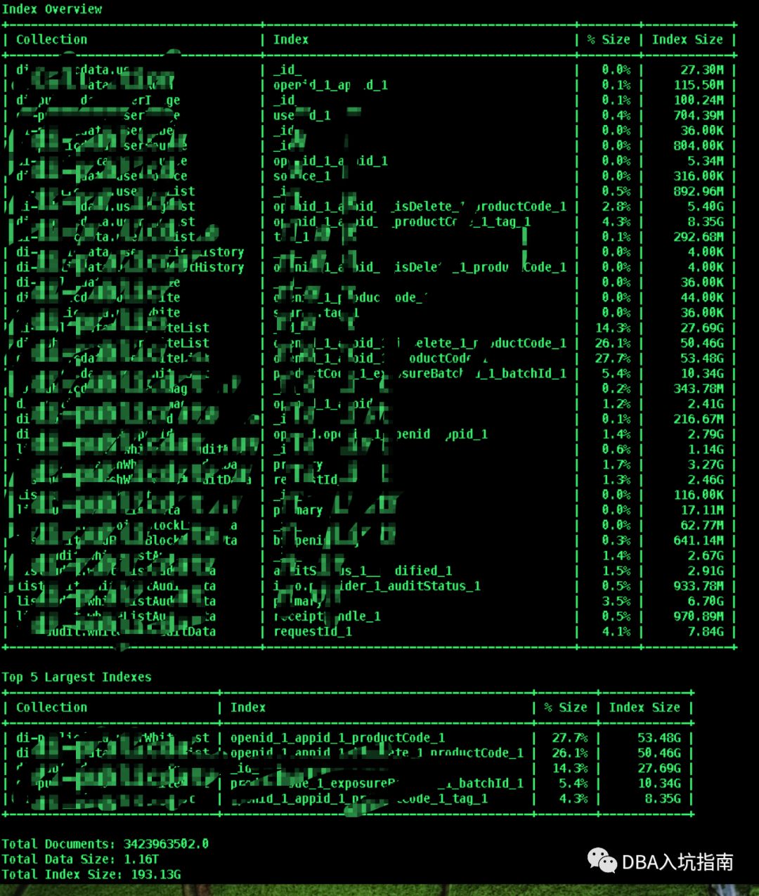 #!/usr/bin/env python# -*- coding: utf-8 -*-"""This script prints some basic collection stats about the size of thecollections and their indexes."""from prettytable import PrettyTableimport psutilfrom pymongo import MongoClientfrom pymongo import ReadPreferencefrom optparse import OptionParserdef compute_signature(index):signature = index["ns"]for key in index["key"]:signature += "%s_%s" % (key, index["key"][key])return signaturedef get_collection_stats(database, collection):print "Checking DB: %s" % collection.full_namereturn database.command("collstats", collection.name)# From http://www.5dollarwhitebox.org/drupal/node/84def convert_bytes(bytes):bytes = float(bytes)magnitude = abs(bytes)if magnitude >= 1099511627776:terabytes = bytes 1099511627776size = '%.2fT' % terabyteselif magnitude >= 1073741824:gigabytes = bytes 1073741824size = '%.2fG' % gigabyteselif magnitude >= 1048576:megabytes = bytes 1048576size = '%.2fM' % megabyteselif magnitude >= 1024:kilobytes = bytes 1024size = '%.2fK' % kilobyteselse:size = '%.2fb' % bytesreturn sizedef get_cli_options():parser = OptionParser(usage="usage: python %prog [options]",description="""This script prints some basic collection stats about the size of the collections and their indexes.""")parser.add_option("-H", "--host",dest="host",default="localhost",metavar="HOST",help="MongoDB host")parser.add_option("-p", "--port",dest="port",default=27017,metavar="PORT",help="MongoDB port")parser.add_option("-d", "--database",dest="database",default="",metavar="DATABASE",help="Target database to generate statistics. All if omitted.")parser.add_option("-u", "--user",dest="user",default="",metavar="USER",help="Admin username if authentication is enabled")parser.add_option("--password",dest="password",default="",metavar="PASSWORD",help="Admin password if authentication is enabled")(options, args) = parser.parse_args()return optionsdef get_client(host, port, username, password):try:client = MongoClient(host=host,port=int(port),username=username,password=password,authSource='admin',authMechanism='SCRAM-SHA-1')return clientexcept Exception as e:print('connect to server failed:%s' % e)def main(options):summary_stats = {"count" : 0,"size" : 0,"indexSize" : 0}all_stats = []client = get_client(options.host, options.port, options.user, options.password)all_db_stats = {}databases = []if options.database:databases.append(options.database)else:databases = client.database_names()for db in databases:# FIXME: Add an option to include oplog stats.if db == "local":continuedatabase = client[db]all_db_stats[database.name] = []for collection_name in database.collection_names():stats = get_collection_stats(database, database[collection_name])all_stats.append(stats)all_db_stats[database.name].append(stats)summary_stats["count"] += stats["count"]summary_stats["size"] += stats["size"]summary_stats["indexSize"] += stats.get("totalIndexSize", 0)x = PrettyTable(["Collection", "Index","% Size", "Index Size"])x.align["Collection"] = "l"x.align["Index"] = "l"x.align["% Size"] = "r"x.align["Index Size"] = "r"x.padding_width = 1index_size_mapping = {}for db in all_db_stats:db_stats = all_db_stats[db]count = 0for stat in db_stats:count += stat["count"]for index in stat["indexSizes"]:index_size = stat["indexSizes"].get(index, 0)row = [stat["ns"], index,"%0.1f%%" % ((index_size float(summary_stats["indexSize"])) * 100),convert_bytes(index_size)]index_size_mapping[index_size] = rowx.add_row(row)print "Index Overview"print x.get_string(sortby="Collection")print "Top 5 Largest Indexes"x = PrettyTable(["Collection", "Index","% Size", "Index Size"])x.align["Collection"] = "l"x.align["Index"] = "l"x.align["% Size"] = "r"x.align["Index Size"] = "r"x.padding_width = 1top_five_indexes = sorted(index_size_mapping.keys(), reverse=True)[0:5]for size in top_five_indexes:x.add_row(index_size_mapping.get(size))print xprint "Total Documents:", summary_stats["count"]print "Total Data Size:", convert_bytes(summary_stats["size"])print "Total Index Size:", convert_bytes(summary_stats["indexSize"])# this is only meaningful if we're running the script on localhostif options.host == "localhost":ram_headroom = psutil.virtual_memory().total - summary_stats["indexSize"]print "RAM Headroom:", convert_bytes(ram_headroom)print "RAM Used: %s (%s%%)" % (convert_bytes(psutil.virtual_memory().used), psutil.virtual_memory().percent)print "Available RAM Headroom:", convert_bytes((100 - psutil.virtual_memory().percent) 100 * ram_headroom)if __name__ == "__main__":options = get_cli_options()main(options)