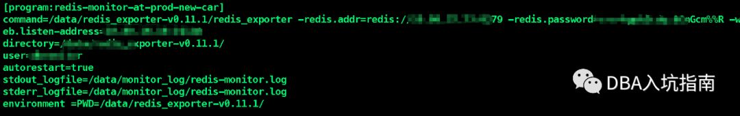 这让我更郁闷了,问题在哪呢?于是想了一下,记起来redis监控进程是用用supervisor管理,于是登录相应机器,查看配置文件中相对应的redis实例信息,发现密码跟打印出的密码一模一样,如图所示
