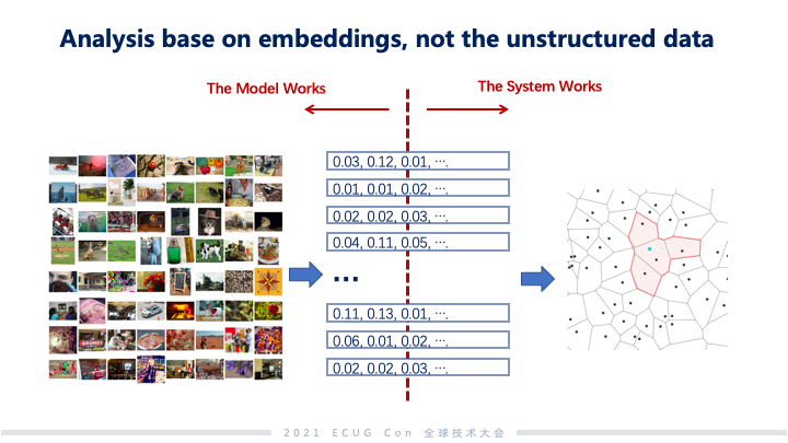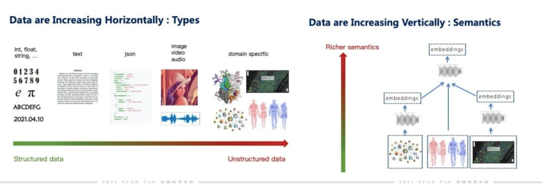 演讲一开始,郭博士从基础软件的角度出发探讨了近几年数据的变化,整体上可以分为两个方面的变化:一个是水平方向,一个是垂直方向。主要是数据种类多样性的变化。最早传统的数据库是一些高度抽象的数据类型,但随着这些数据越来越多样化之后, 数据的抽象程度逐渐地降低。主要是借由神经网络提取非结构化数据里面的内容和语义。这部分在发展和能力上都有很显著的提升。提取内容和语义的过程叫做 embedding,这个提取出来的东西叫向量。物理上它就是一个稠密的浮点数向量的形式。越往高处的 embedding 越会综合多个维度的信息,这些 embedding 对于数据的描述更立体,语义也会更丰富。综合水平和垂直两个方向的变化,我们发现 embedding 很重要,在 embedding 这一层,它可以很好地去汇总数据横向类型的扩张和纵向语义层面的扩张。特别是 embedding 这个向量的类型也是一种高度抽象的数值类型,这样就给我们做系统软件的人提供了一个非常好的数据基础。虽然说文本的分析和搜索有 ES (ElasticSearch),但是除了 ES 以外还有非常多不同的非结构化数据,以现在数据扩张的速度如果每一种都做一个非结构化系统,这个工作量将很难想象。 非结构化数据的处理和分析