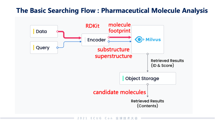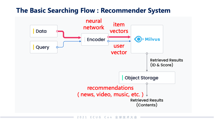 搜索的流程大致上分为 AI 驱动的搜索与神经驱动的搜索。数据和查询语义这两方面都通过 Encoder 投射到 embedding 空间里面去产生向量,查询到的结果会以 ID 或者是打分的形式投出来,然后再根据这些 ID 找到对应原始存储里面的物料。以推荐系统为例,推荐系统里利用了许多神经网络模型,在通过这些模型之后,比如说我们刷的视频或者是文本新闻这些信息会形成 item vectors;对应的用户使用偏好也会形成 user vectors,这两个 vectors 在 Milvus 里面去做综合的分析。从这些用户最近被观察到的行为分析下来以后,哪些内容是他们最感兴趣的,最终通过系统反馈之后给出来的,就是大家手机上看到的一系列的推荐内容。生物制药分析也是可以透过这样的方式去做分析和搜索。药物筛选时,会从药物的子结构去匹配病毒上面的蛋白质特征,如果能匹配上那就意味着它们有可能产生一个治愈的效果。在 embedding 或者是向量空间里面,可能产生效果的药物和病毒的分子结构距离会比较近。最终筛选出的结果会是一系列候选的药物分子式,以及关于药物的详尽内容。这些信息会进一步再给医药的专家们做更深入的分析。 Milvus vs. ElasticSearch