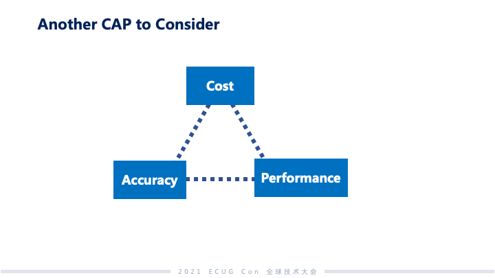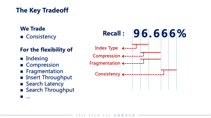 从 Milvus 项目开始到现在历经了一年多时间,我们在做这个项目中也遇到了很多 CAP tradeoff 的问题,接下来我将会分享我们在这方面的经验。第一类系统:比较典型的像 TP 类的数据库系统,更加关注的像事物性、强一致。第二类系统:更多关注的是在以往的全量数据上面做推理和分析,从而挖掘数据的价值。Milvus 属于第二类系统。第二类系统,基本上都是 AI 和神经网络做驱动的,这些系统更多讲的不是 100% 准确,一方面理论上有一些方法上限到不了 100%;另外一方面,虽技术上可以达到 100%准确,但是最后一公里的成本会非常高。 这个图是我们做检索准确度和检索性能的一个关系,可以看到随着准确率越来越逼近 100%,整个系统性能呈现急剧下降的趋势。对应来说,成本上面要保证足够的投入才可以同时得到高准确度与高性能。我们开发 Milvus 系统的时候,还遇到了另外一个 CAP 要去做权衡,那是什么呢?就是成本(Cost)、准确度(Accuracy)和性能(Performance)这三个的权衡。在非结构化数据分析领域,用户在这个三角里面应用的点是很不一样的。比如说在大规模的推荐系统里,性能和准确度实际上和系统用户的体验和黏性非常相关,所以在规模大的时候,对于成本上升还可以接受。但对于我们刚刚讲的生物制药这一类,基本上是离线去做筛查药物的侯选,这个时候对于性能没有那么敏感,更多时候用户可能会选择拿性能去换成本。所以第二类系统,其实不是 100% 准确反而比较重要,因为我们要去在里面给用户足够的空间,让他们根据成本、性能、准确度做 tradeoff。我们发现其实还蛮难的,因为准确度这个事情和系统里面很多的因素都有关系。Milvus 是一个搜索系统,和准确度相关的最主要的一个指标就是 Recall,中文叫做查询率。一个查询如果查询返回的结果都是我想要的,那准确率就是 100%,如果有 10 条不是我想要的,查询率就是 90%。Embedding 的准确度、索引的类型、是否使用压缩数据的方式、传统的一致性,还有可变性等这些都会有影响。举个例子,像模型的准确度和查询准确度的变化,因为神经网络这样一些模型很难做到 100% 准确,这样用这些模型做 embedding,最终产生的 embedding 的向量和实际理想的向量有一定的偏差,这些偏差会导致搜索最后结果准确度的变化。我们发现在 Milvus 应对的场景中,系统读副本和写入之间的延迟对 Recall 影响最低,基本上就是小数点后面几位。给我们的启发就是,可以拿一致性换其他的系统指标。我们也将这个思路应用到了 Milvus 2.0 的架构设计上。 Milvus 2.0