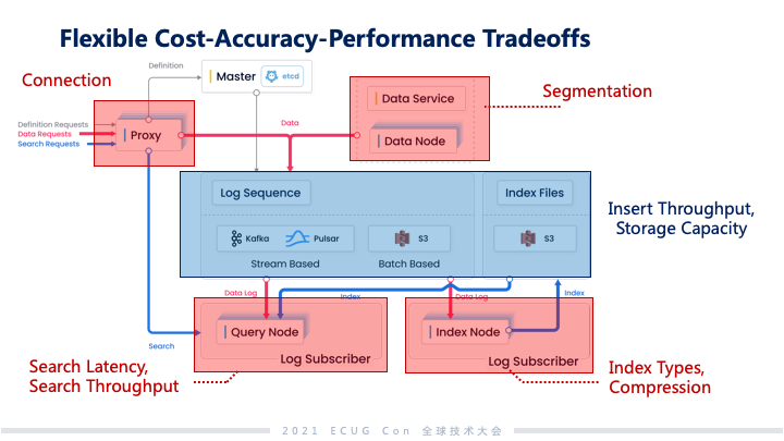 我们做的最主要的一件事是把日志子系统提出来,像这样的系统对于数据一致性的要求要低很多。我们还构建成流批融合的日志系统,这个系统是支持发布和订阅的。批处理的部分和流处理的部分我们分成两层,流的部分做到能够让订阅者或者是系统的副本快速看到变化,能够达成近实时同步的能力。批这部分的日志是面向系统全量日志维护的能力,具备更高的可靠性和更大的容量。因为 Milvus 的系统主要的服务都是基于索引的,我们会在向量和标签上面构建丰富的索引生态,再往上的生态和搜索都是索引基础之上做的,所以索引没有做传统数据库的图表结构。Milvus 里面把数据作为日志,没有做独立的库表结构,很大程度上降低了数据维护的复杂度。另外在发布和订阅层面,我们和其他相关的项目一样,也是把相关日志逻辑的通道和物理的通道做隔离,这样整个日志系统能够比较好地做伸缩。把日志系统提出来之后系统变成这样子,中间蓝色部分是日志序列。我们可以支持用户去选择底层的引擎,在这个基础之上,其他的系统组件被自然解耦出来,这些组件可以做分组件级别的组内的弹性。这个对于 Milvus 来说非常重要,因为向量分析是属于一种计算密集和内存密集的应用。像上面一些日志的规整、连接管理模块和下面偏计算的节点所需要的资源类型都不太一样。根据用户负载的不同和对应他们占用到的物理资源,可以独立地去做弹性,这样一方面可以综合帮助用户达到一个比较好的降成本的效果,另外也可以独立地调动对于系统来说比较好的机制。除了节点可以独立地调动之外,这样的结构可以很好地去做支撑查询的准确度、性能等。上面提到需要做 CAP 权衡的,像索引的类型、数据量的压缩,还有查询的延迟、查询的吞吐,这些都可以落到不同的系统模块里面。根据用户对 CAP 不同的考量,这些系统模块可以做灵活的适配和相应的裁剪。 其他的探索工作