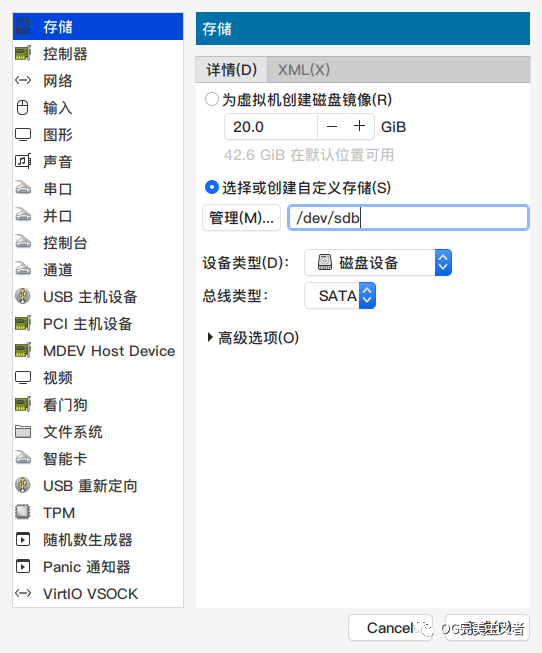 启动虚拟机之前我们需要修改一下硬件配置,首先我们需要给虚拟机添加一块硬盘。这里你可以选择添加qcow2硬盘文件,或者直接把物理硬盘透传给虚拟机(性能更优)。这块硬盘用于安装和运行操作系统。如下图所示将硬盘sdb透传给虚拟机。