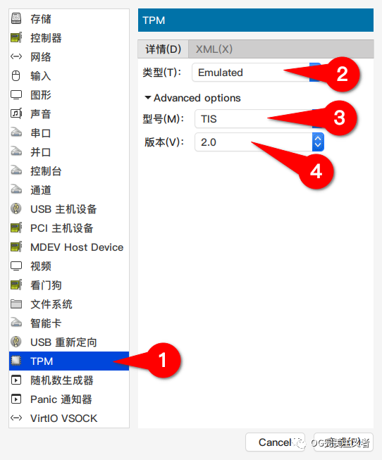 接下来是这篇文章的关键部分。首先我们需要点击上图左下角的“添加硬件”按钮,然后在弹出的硬件列表中选择TPM,并按照下图所示设置其类型、版本、型号;