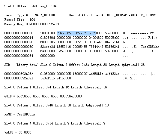 --查看该行记录,正常SELECT [GUID],[SID],[NAME],[VALUE]FROM [TestDBSubA].[dbo].[Test]WHERE GUID='65656565-6565-6565-6565-005056c00008'--第一列[SID]被writepage更改了,所以此时更改[SID]将报错!UPDATE T SET [SID]=SUSER_SID()FROM [TestDBSubA].[dbo].[Test] TWHERE GUID='65656565-6565-6565-6565-005056c00008'