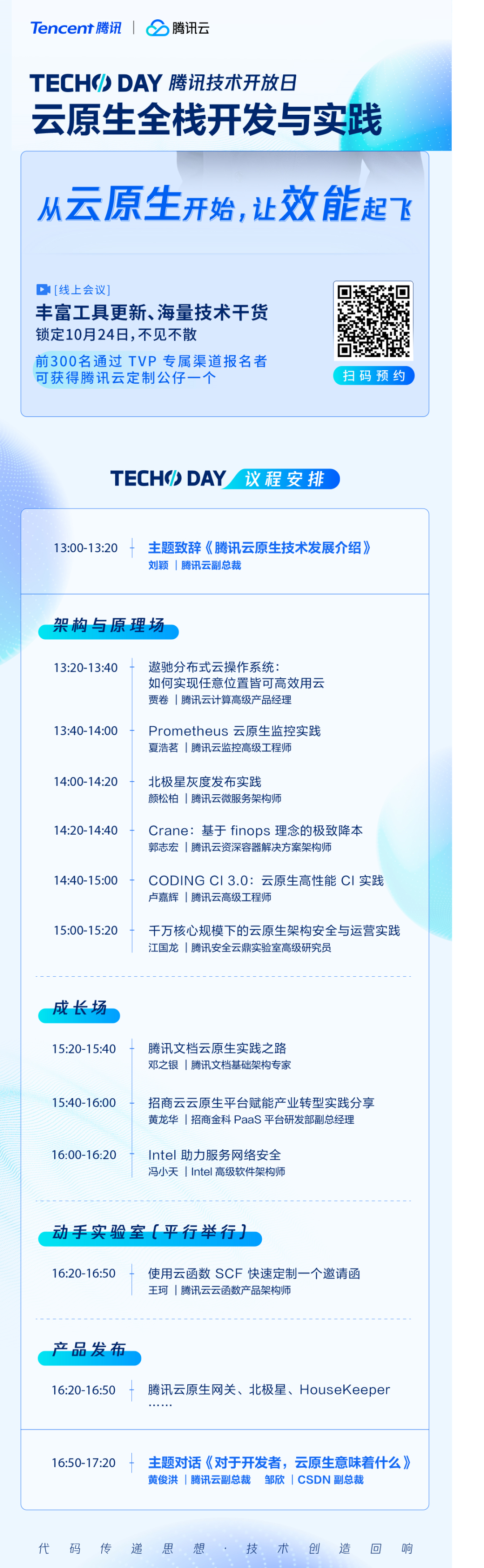 下周一是10月24日,作为程序猿都很熟悉的1024,第二期Techo Day腾讯技术开放日将在线上举办,本期主题为「云原生全栈开发与实践」,会上将有多个云原生最佳实践分享,6款热门产品技术解读。