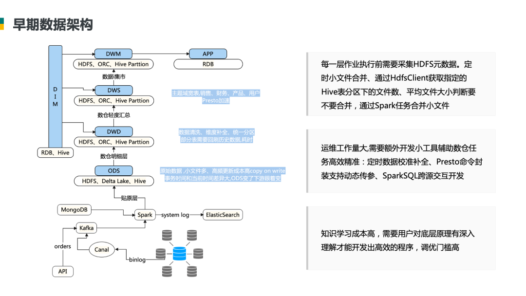 例如,在 ODS 层,新更新的数据有可能是几个月之前的订单,比如订单的状态发生了变更,早期的架构是需要记录更新数据的对应日期,并将对应日期的数据更新一遍,那么 DWS 和 DWD 也要跟着进行变更,这样会带来很大性能问题。