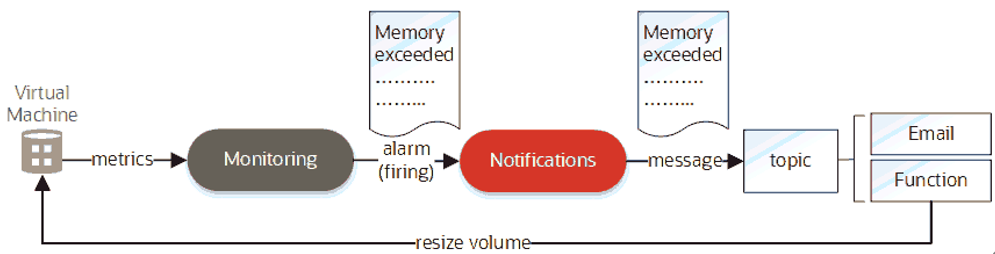例如,我们使用公有云时,通常希望配置的虚拟服务器(VM)可以按照监控指标自动伸缩,这样既能满足客户使用体验要求,也可以最大限度地节约成本。实现这种场景可以通过编写一个Function来调整服务器的大小,以及创建一个向该Function发送消息的告警。如下图所示: