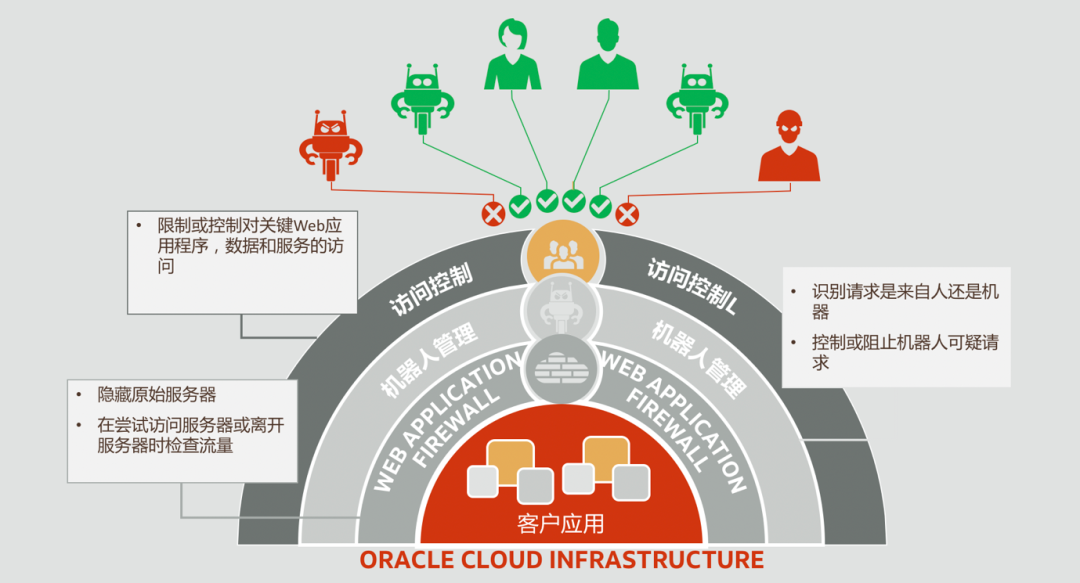 OCI WAF是一个位于OCI互联网边界上的服务:将来自Internet的外部安全威胁隔离限制在应用环境的边界上,保护用户核心层的应用&数据免受来自外部网络的安全威胁;内置250+网络应用风险威胁防御规则,引擎具有机器学习、技术领先的功能,智能、自动、高效。