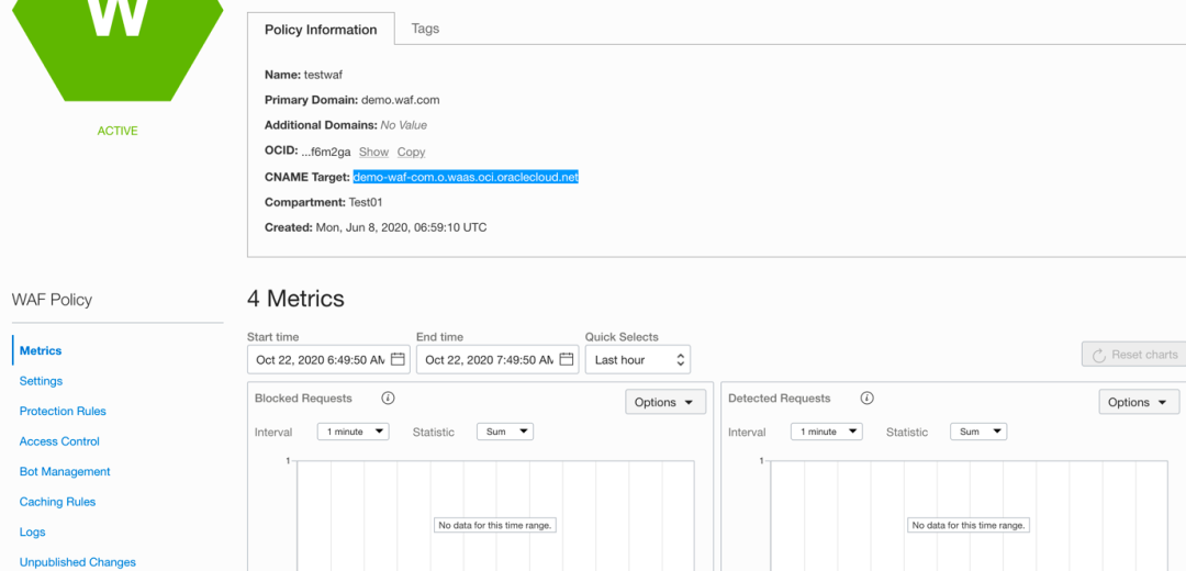 配置完成后,生成CNAME Target:demo-waf-com.o.waas.oci.oraclecloud.net