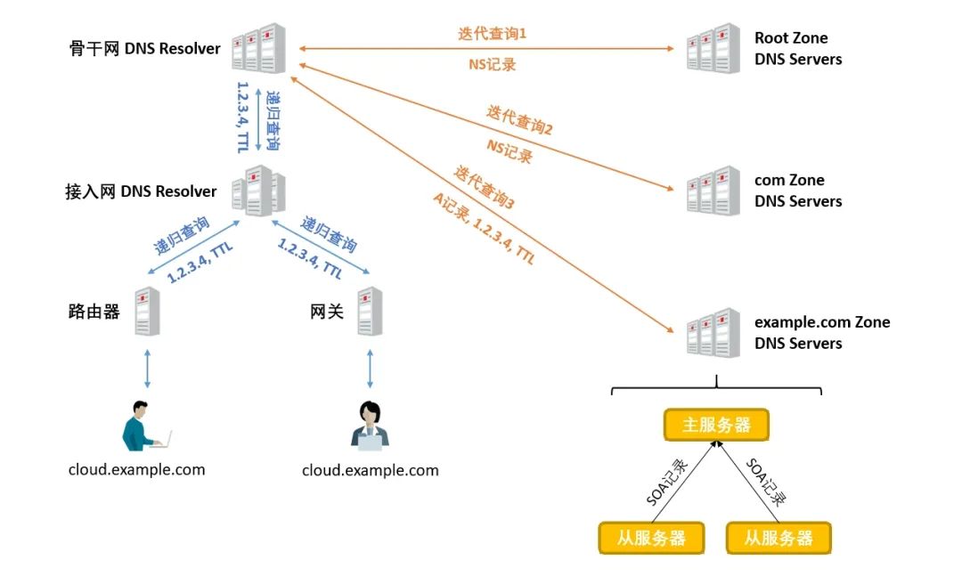 为了查询域名cloud.example.com的IP地址,需要从根域名服务开始,通过迭代查询的方式,顺着NS记录的指引,一步一步找到托管example.com Zone的域名服务。作为互联网基础服务,域名服务一般由一组服务器构成,从服务器按照SOA记录的配置,定时从主服务器拉取域名信息,并在本地维护一套只读的副本,以此来对外提供高可靠低延迟的访问能力。