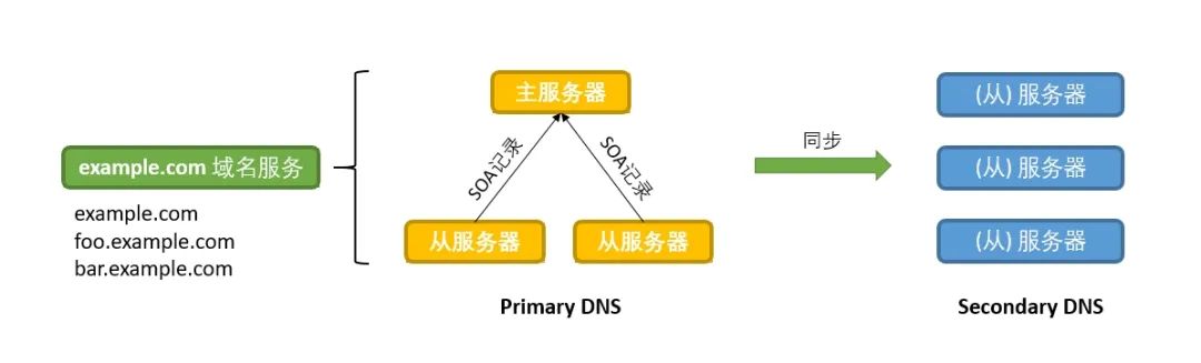 如上图所示,部署Secondary DNS本质上是在不同的服务商那里托管一组从服务器,域名记录的变更只能在Primary DNS一侧进行,Secondary DNS只会保存只读副本。另外值得注意的是,这里的Primary和Secondary并不是通常的主备概念,Primary DNS和Secondary DNS其实是同时在对外提供服务,而且具体使用哪个服务是由客户端随机选择的,并不是只有在Primary DNS宕机后才由Secondary DNS接管。