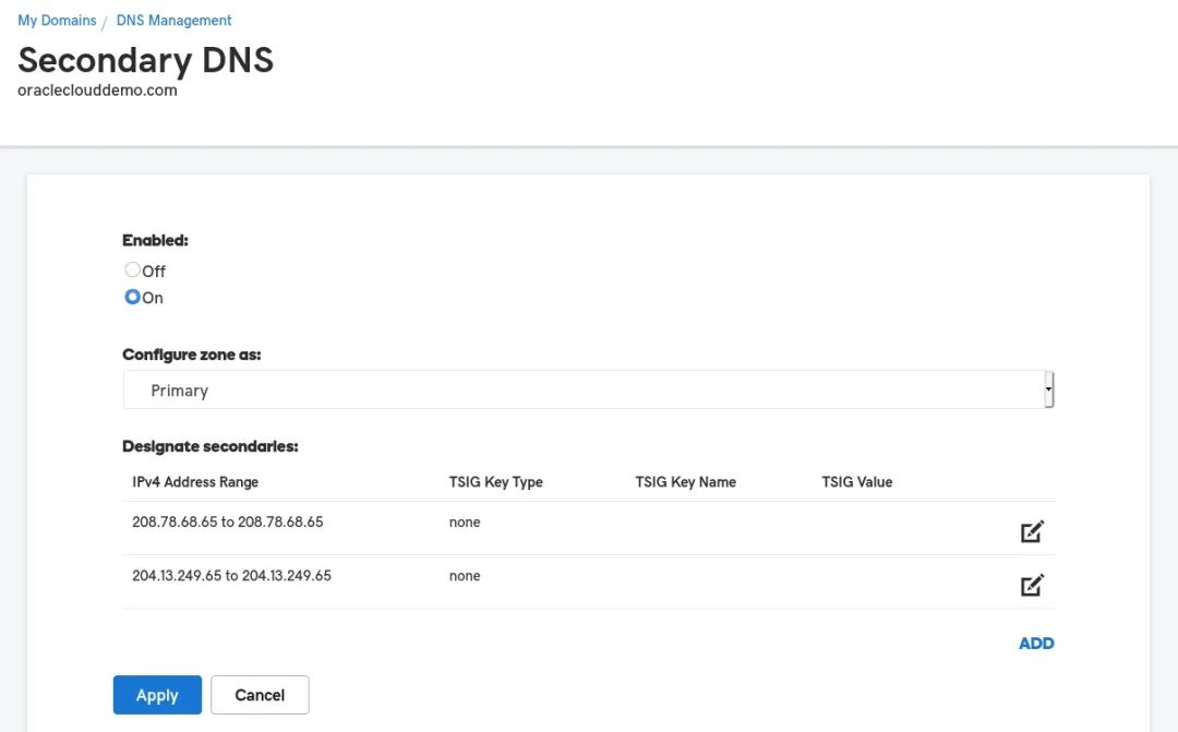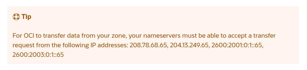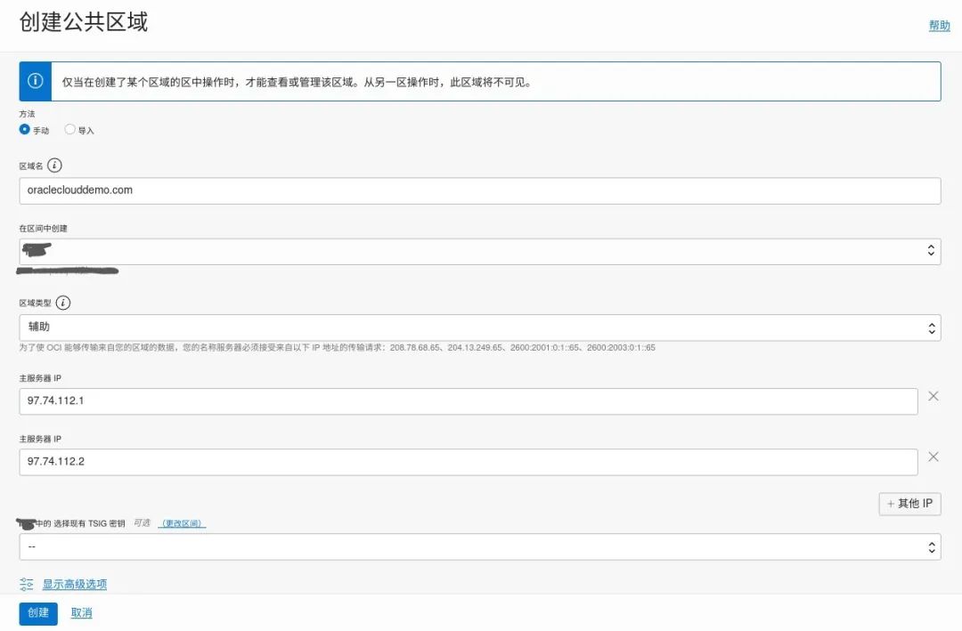 首先,在域名服务商那里开通Primary SecondaryDNS服务,并且将来自OCI DNS的IP添加为信任地址: