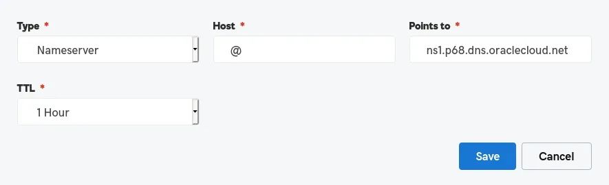 最后,我们希望通过修改NS记录来告知客户端,可以到OCI DNS这里来进行查询了。由于OCI在这里是作为Secondary DNS,所以相关的配置还是需要到域名服务商那里进行操作: