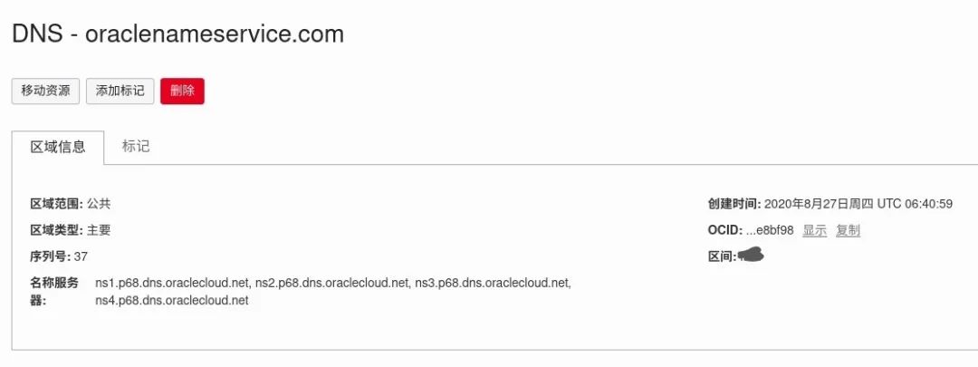 截图中填写的OCI域名服务器的地址可以到Zone的详情页面查询: