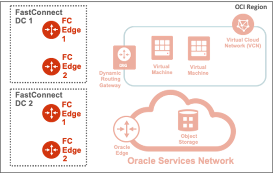 Oracle在全球各地都有许多部署OCI的位置,称为区域Region。每个Region都有一个或两个物理入口位置,称为FastConnect DC(FastConnect 数据中心)。FastConnect DC是进入OCI Region的入口点。客户将建立与FastConnect DC的连接。此外,每个FastConnect DC都有冗余硬件。如下图所示。