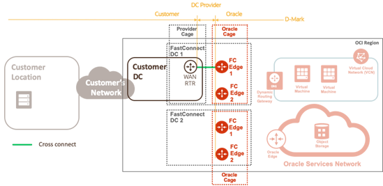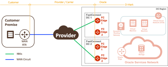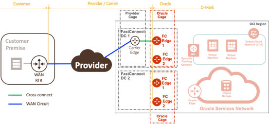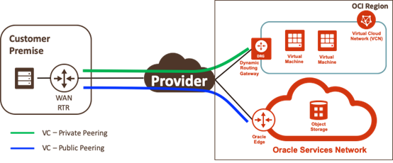客户的数据中心和OCI之间通过网络运营商提供的私有或者专用线路连接起来。如果客户已经和网络运营商有联系或者没有OCI FastConnect的合作伙伴可以提供客户数据中心到OCI之间的连接,可以采用这种方式。