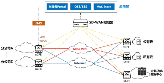 比较常见的 SD-WAN 应用场景中,采用Internet和专线共存方式,通过引入SD-WAN 控制器,完成了分支机构 CPE 设备的集中管理及自动化配置,包括各种 Internet 接入及专线接入的配置管理等。