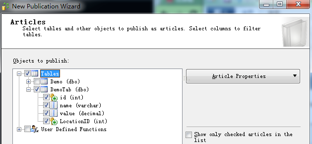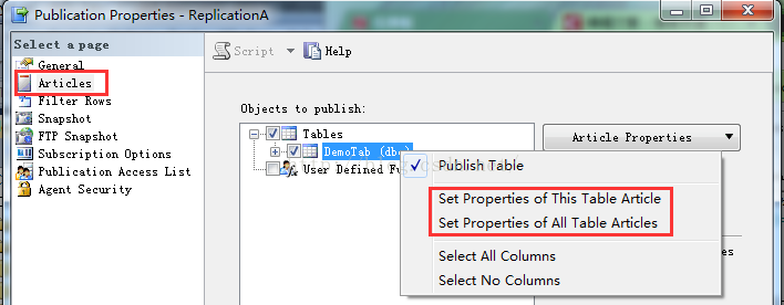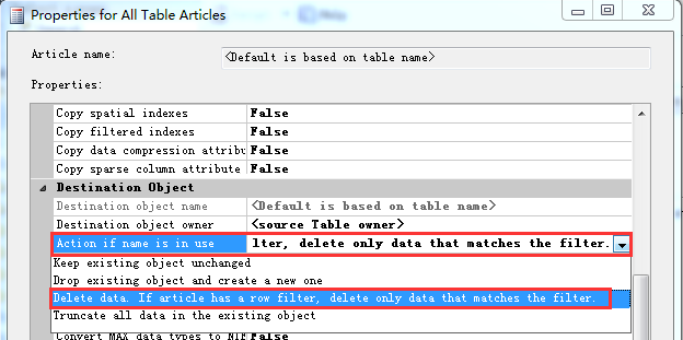 选择设置所有表,设置属性 “名称已被使用时的操作”为 “删除数据,如果目标有行筛选器,仅删除与该筛选器匹配的数据(Delete data,If article has a row filter, delete only data that matches the filter)”