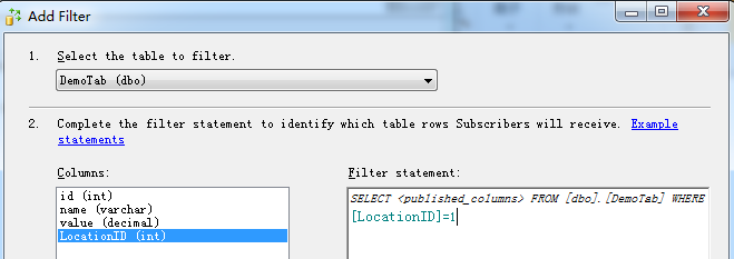 下一步,设置行筛选器,筛选条件为 [LocationID]=1(这个是数据库 [TestDBSubA] 的发布),同理设置 [TestDBSubB] 的发布!