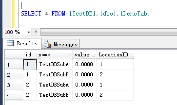 INSERT INTO [TestDBSubA].[dbo].[DemoTab]([name],[value]) SELECT 'TestDBSubA',0INSERT INTO [TestDBSubB].[dbo].[DemoTab]([name],[value]) SELECT 'TestDBSubB',0SELECT * FROM [TestDB].[dbo].[DemoTab]