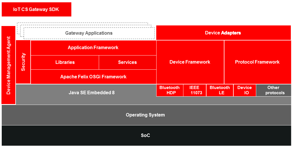 Oracle 物联网云服务网关:一套可随时部署的嵌入式 Java SE 应用,适用于运行附带的嵌入式 Java SE 的网关类设备。该应用提供了一套完整的功能来实现安全可靠的消息传递,同时包括了设备适配器框架。针对由于协议支持(例如:蓝牙、ZWave、Modbus、OPC)或安全原因而无法直接连接的设备,该框架可捕获此类设备并帮助设备进行连接。