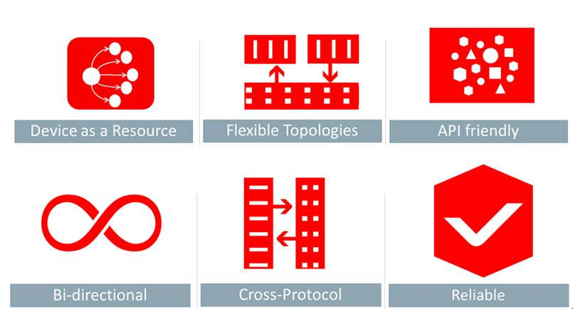 设备虚拟化:如何从大量互联设备客户端安全可靠地获取类型广泛的消息,是物联网的关键挑战。设备虚拟化是应对的关键,设备虚拟化允许企业应用在集成设备时,无需考虑物理设备相关的问题,如,设备安置在哪里,设备当前是否连接状态,设备是如何连接的。每个设备在云端都作为一组资源出现,可以声明数据属性和消息格式。可以监控设备健康情况,性能以及位置。