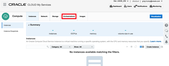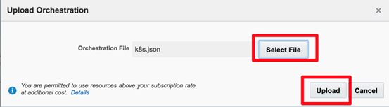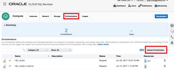 我们看一下如何使用这个模版和脚本来从无到有在OracleCompute云上创建一个Kubernetes集群。首先将上面的Orchestration模版复制粘贴到一个文本文件中,并要修改一下模版的内容,主要是用户的域名城和Compute云用户,需要按照你自己的实际情况修改,具体操作可以将现有模版中的<IdentityDomain>和<OPC Account>这两个字符串替换为你自己Oracle Compute帐户的相应字符串。接下来进入Compute控制台的Orchestration功能点击Upload Orchestration按钮: