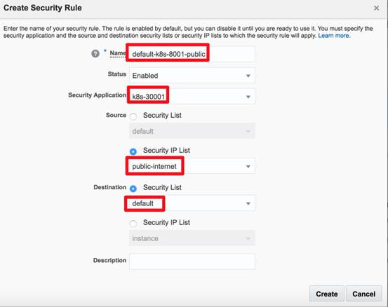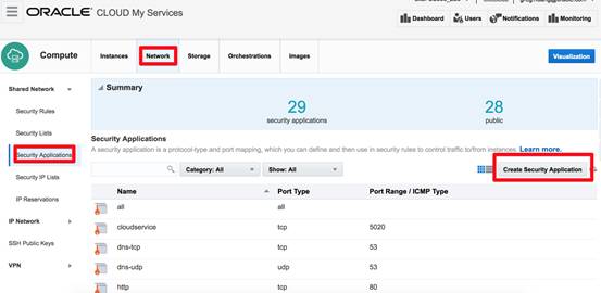 接着在命令行工具中我们就会看到有很多Kubernetes的服务被创建出来,接着我们要设置Oracle Compute云的防火墙来让我们可以通过互联网能够访问到这个新部署电商网站。这个网站最终会发布一个Kubernetes对外端口30001让用户能够通过浏览器访问,因此我们要新建一个SecurityApplications: