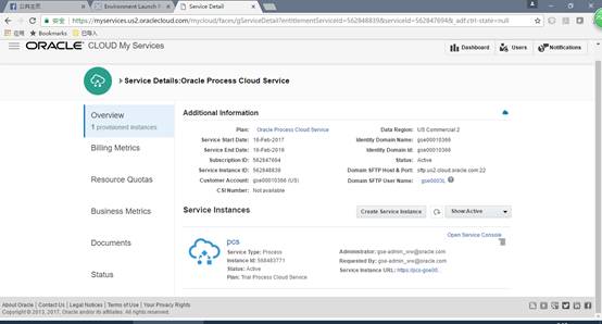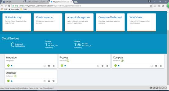 打开cloud.oracle.com,输入用户名/密码后,进入看到如下的实例界面,选择Process
