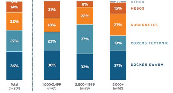典型的生产应用需要处理运行在跨主机上的容器的负载,处理跨主机和生产环境要求的复杂结构需要一些管理工具,一些流行的解决方案包括Mesos/Kubernetes/Docker Swarm。根据451 Research最近的一份调查统计,Mesos/Kubernetes/Docker Swarm占据了容器调度市场绝大部分市场份额(注:图中的CoreOS TECTONIC基于Kubernetes),本文将对这三种容器调度工具做一个比较: